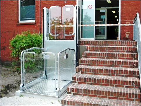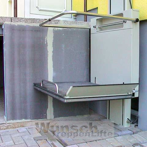 ![]() | ROLLSTUHLHEBEBÜHNE an einer Aussentreppe Absturzsicherung durch Bügel, überdacht bei Bremen WTL - HB 1000 |